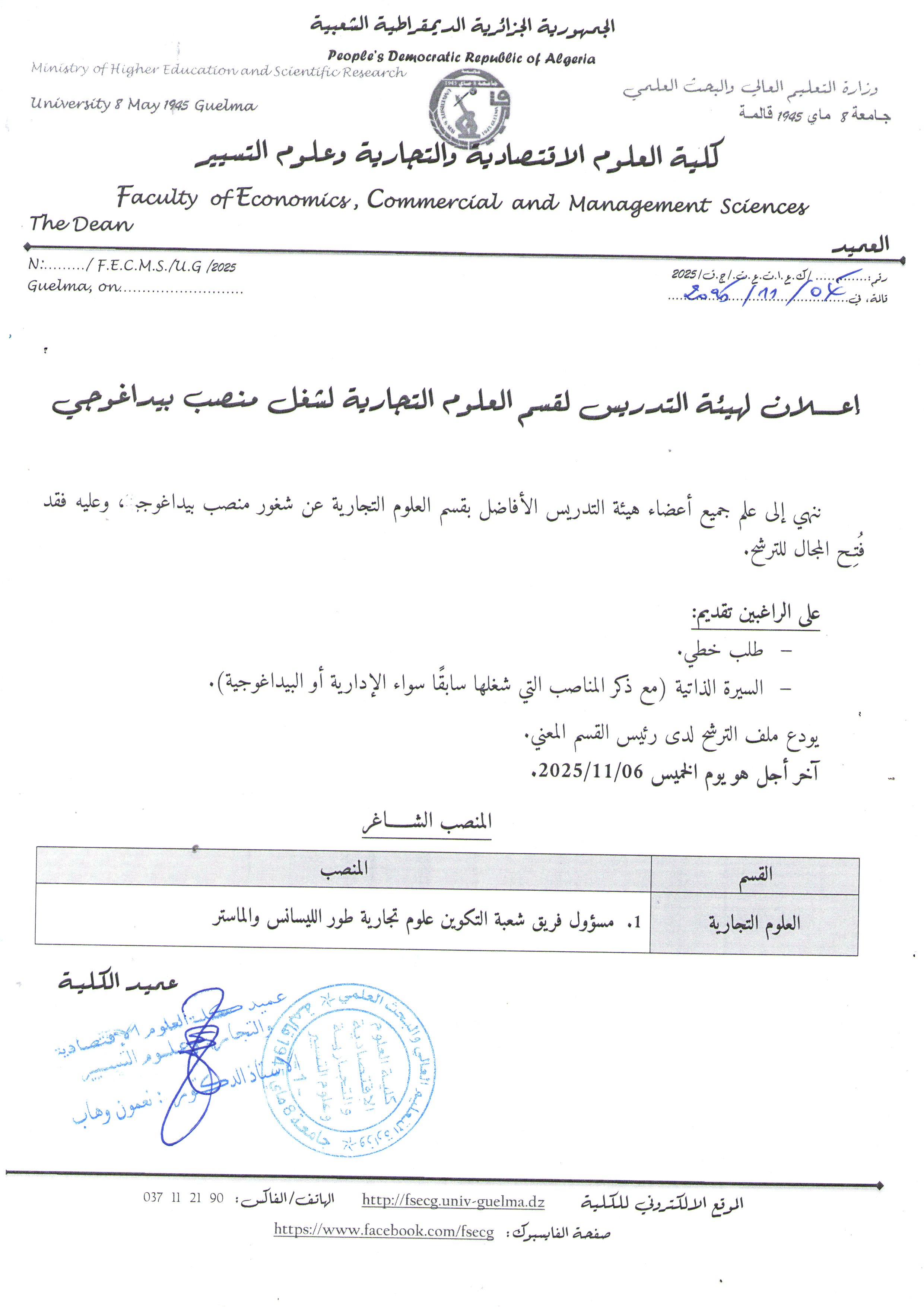 اعلان لهيئة التدريس لقسم العلوم التجارية لشغل منصب بيداغوجي
