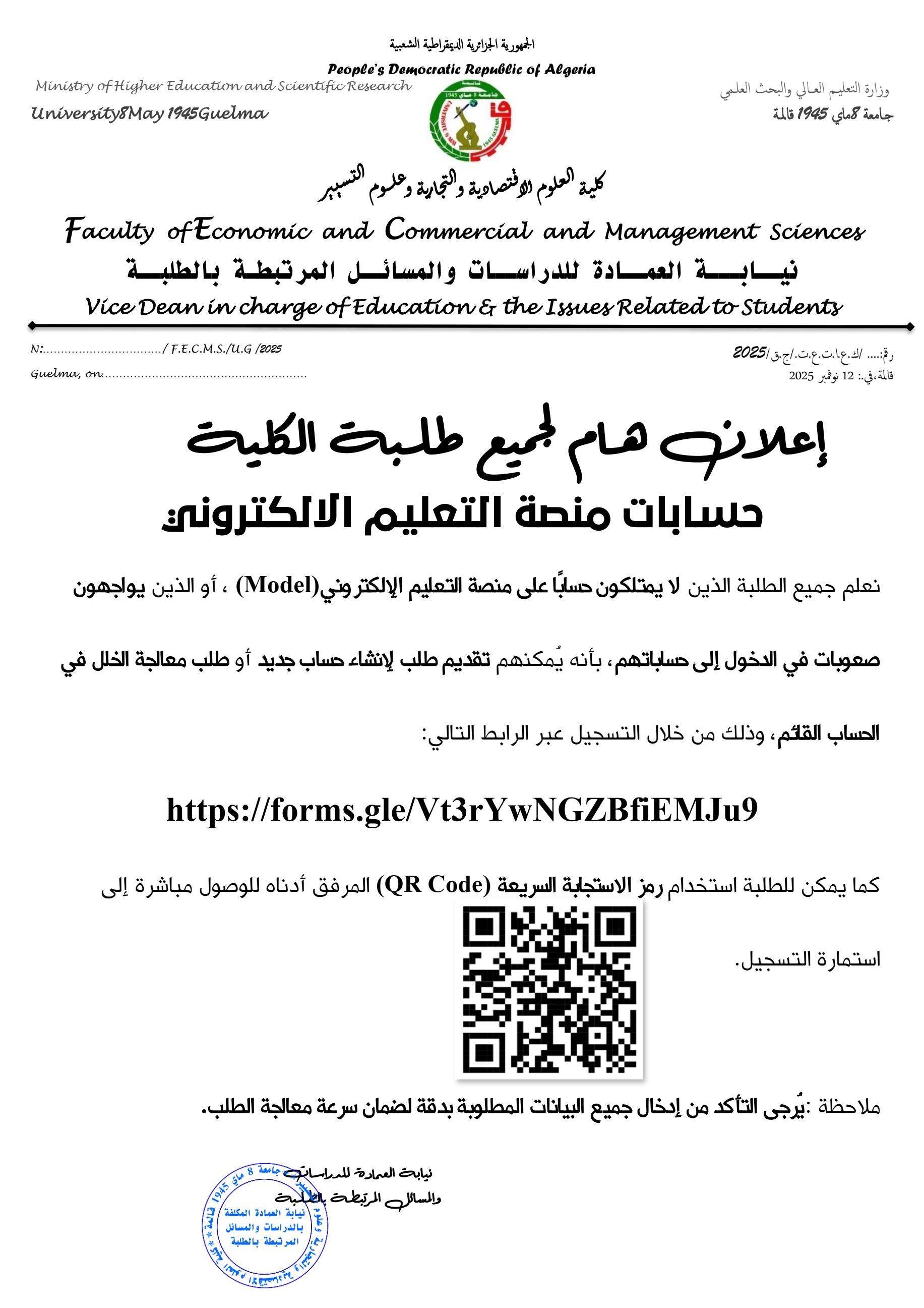 الاعلان(المتعلق بفتح حسابات على منصة التعليم الإلكتروني (Model) ومعالجة مشكلات الدخول إلى المنصة) الرابط Tags annonces faculté Wed, 11/12/2025 - 14:41