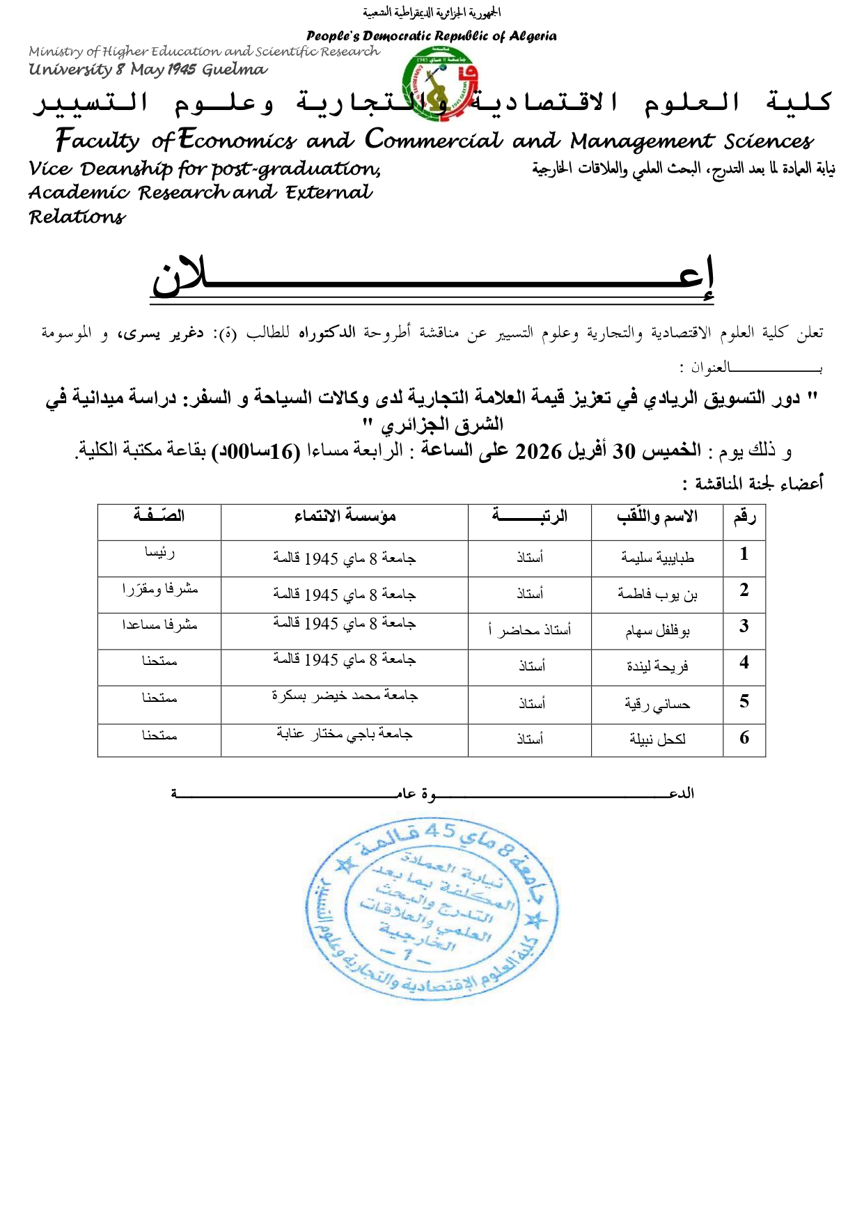الطالبة :دغرير يسرى قسم :العلوم التجارية عنوان الاطروحة :"دور التسويق الريادي في تعزيز قيمة العلامة التجارية لدى وكالات السياحة والسفر:دراسة ميدانية في الشرق الجزائري" يوم : الخميس 30 أفريل 2026 بتوقيت 16:00 مساءا. المكان:بقاعة مكتبة الكلية |